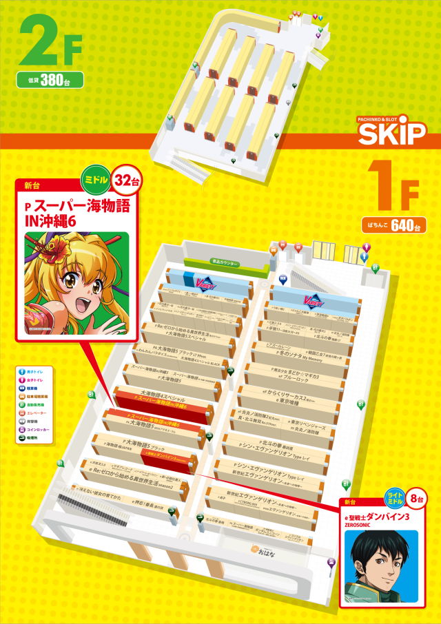 1F、2Fの2フロアに1,020台のパチンコが設置されている巨大パチンコ専門店です。SKIPの中では一番大きい店舗です。