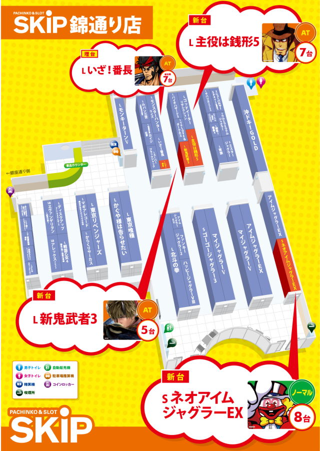 小田原で唯一のスロット専門店です。もちろん専門店なので、台数もエリア屈指。いつも最新台を大量導入しているので、SKIPなら打ちたい台にすぐ座れるかも?